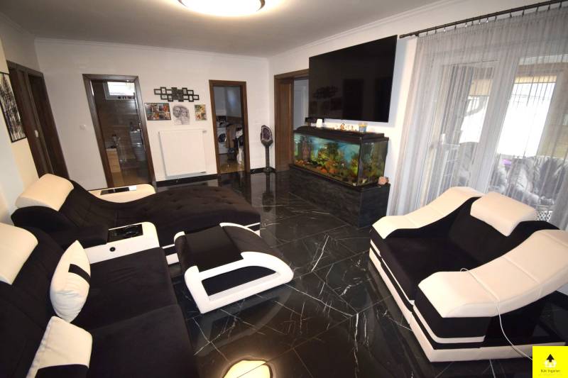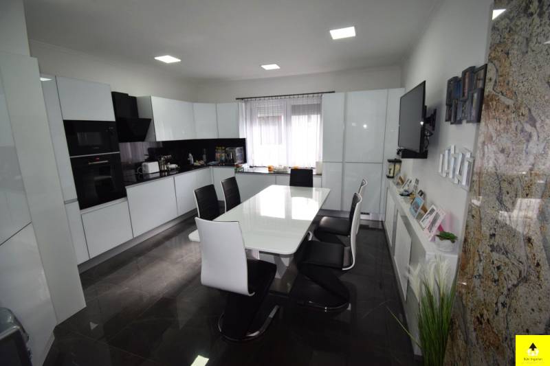 Bükön csendes, nyugodt környezetben eladóvá vált egy minden igényt kielégítő két generációs családi ház.Az ingatlan egy szinten 354 m2. Az épület 2/3 része 2020-ban épült és a többi rész teljeskörű felújításon esett át.A tulajdonos az építés során elsődleges szempontnak tekintette a mai kor igényeinek megfelelő, minőségi anyagok felhasználását és szakszerű kivitelezést. Az épület két külön bejáratú lakrésszel (2 nappali + 2 konyha) rendelkezik, melyből az egyikben akadálymentes terek kerültek kialakításra. Az épület energia felhasználásának minimalizálását a prémium kategóriás nyílászárók, a korszerű homlokzatszigetelés és a 45 cm-es padlásszigetelés, valamint a takarékos kondenzációs kazán garantálja. Az egész ház fűtése a leghidegebb téli hónapban is csak 22 ezer forint volt.A belső terek kialakítását az átgondoltság, a praktikum, az élhetőség és az egyedi megoldások jellemzik.A berendezés a kényelem és stílus ötvözete. A házban az egyedi gyártású borovi fenyő beltéri ajtók, modern prémium minőségű szintén egyedileg gyártatott üveg konyhabútor, ami kimagasló minőségű gépekkel beépített, a lézervágott kerámia burkolatok, a különleges megvilágítások, a 3 fürdőszoba egyedi megoldásai és még számos extra mind-mind az ott élők kényelmét hivatott ellátni.A lakótereken kívül az épületben kialakításra került egy 3 állásos garázs, ahol automatizált garázsajtók biztosítják a kényelmes parkolást és a lakóterek is megközelíthetők a garázsból.Valamint kialakításra került 15-20 fő befogadására alkalmas helyiség, ami a családi, baráti összejövetelek színtere, de működhet konditeremként, irodaként is. Az épület 1681 m2-es telken helyezkedik el. Az udvar egy része térkővel burkolt és a többi terület füvesített. Található még egy hangulatos kis kerti tó az udvaron, egy fedett kiülő kemencével, egy kút és kerti szerszám tároló.Az ingatlan teljes berendezéssel eladó. A ház két külön bejárattal rendelkező lakótérrel rendelkezik, így generációk zavartalan együttélését tudja biztosítani. Esetleg balatoni ingatlan beszámítása lehetséges.