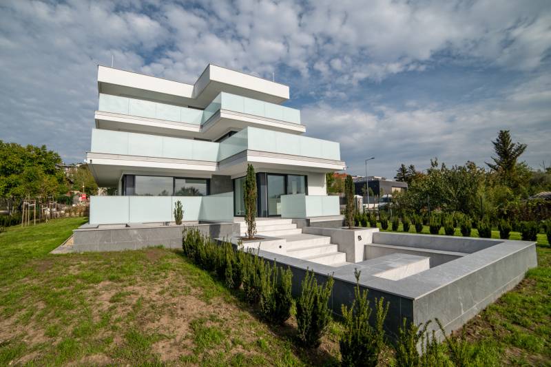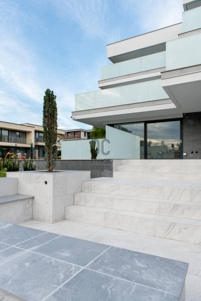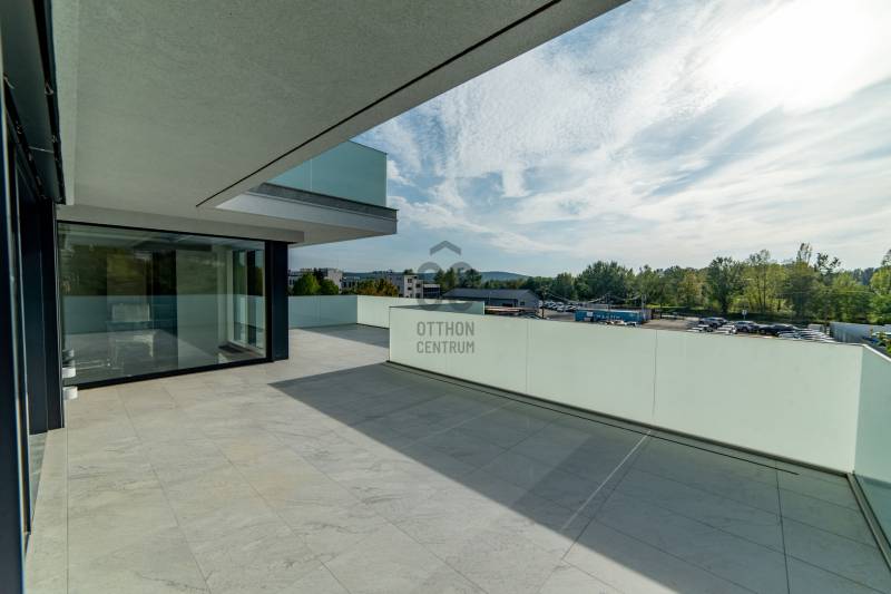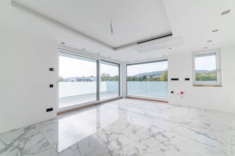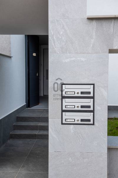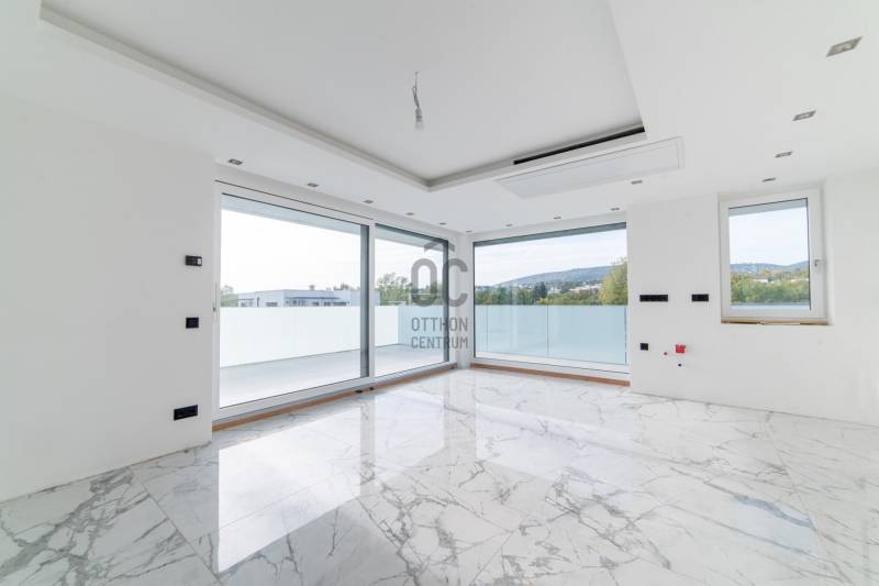 Eladásra kínálunk egy első emeleti lakást ebben a háromlakásos társasházban Madárhegy és Gazdagrét között, gyönyörű panorámával a Péter- és Vadászhegyre.Az épület jellegének, karakterének meghatározásánál figyelembe vették a szomszédos ingatlanok helyzetét, tájolását, növényzetét és beépíthetőségét. Teraszház jellegű épület tömeg került kialakításra modernséget tükröző arányrendszerrel úgy, hogy az Észak-keleti homlokzat és az út csatlakozás felőli Dél-keleti homlokzat zárt Keleti sarokban elhelyezett lépcsőházzal, míg a szomszédos kertek felé néző napos, panorámás Dél-nyugati homlokzat az Észak-nyugati homlokzat felé fordulva nyitott lakótérhez nagy üvegfelületekkel kapcsolódó nagy teraszokkal.Alaprajzi elrendezésben a lakások tágas lifttel ellátott világos lépcsőházból közelíthetők meg. A lakásokba lépve előtérbe érkezünk, mely közvetlenül az amerikai konyhás nappalikba vezet, ahonnan szép kilátás nyílik a nagyméretű üvegfalakon keresztül. A nappali tér nagyméretű tolóajtókkal nyitható össze a teraszokkal, így élvezhetővé válik a lakókert és a kertvárosi környezet a lakásokban élők számára. A lakások egyik hálószobája a nappaliból nyílik, míg a többi háló elkülönülve külön terasszal kerül kialakításra. Minden hálószobához tartozik fürdő és gardrób.A tervezett lakóépület pince, földszint és két emeleti szinttel kerül kialakításra. A földszinten és a két emeleten egy-egy lakás valósul meg, összesen tehát három lakás. A felső szinten lévő lakáshoz 65 m2-es kizárólagos használatú tetőterasz épül.A kiszolgálóhelyiségek a pinceszinten helyezkednek el. Itt négy darab gépkocsi parkoló, bicikli, takarítószer, kertieszköz, kuka és a lakásokhoz tartozó tárolók lesznek kialakítva. A parkolókhoz elektromos autó töltőállomás kerül kialakításra.A ház természetes klímáját a 44 cm vastag, hőszigeteléssel ellátott külső térelhatároló falszerkezetek, valamint a nappali és a szobák nagy üvegfelületei előtt végig futó vízszintes előtetők-árnyékolók, az INTERNORM - STUDIO KF500-as üvegfalak-ajtók-ablakok - Hőszigetelés (W/m²K-ig) Uw 0,61 - és az üveg szerkezetek előtt futó árnyékolók, zsaluziák biztosítják. A külső nyíllászárók maximális RC1N, RC2 betörés elleni védelmet nyújtanak, és a lakások lépcsőházból nyíló ajtói MABISZ minősítéssel rendelkeznek. Külső határoló falai 44 Pth téglából készültek, Internorm homlokzati nyílászárókkal ellátva, zsaluzia távirányítható árnyékolóval kiegészítve. Külső homlokzaton nem éghető 6 cm vtg kőzetgyapot hőszigetelés található.A födémek monolit vasbeton, ugyanúgy, mint a lépcsőház és liftakna és az épülethosszában végig menő merevítő fal, a földrengés biztonsági előírások miatt.Lakás bejárati ajtók Internorm gyártmányúak. Belső ajtók: toló ajtók ill. Eclipse tapétaajtók.A belső burkolatok Cesare Ceramica olasz nagyméretű gress lap, valamint 12 mm vastag fa parketta. A lakásokba a nappaliban biokandalló kerül beépítésre.A szobákban a falak színe kérésre változtatható.Épület külső homlokzatán, lépcsőházban és a teraszokon szintén nagyméretű Cesare Ceramica lapok vannak elhelyezve, a terasz burkolatba résfolyóka került elhelyezésre az üvegkorláton belül. Teraszok vízszigetelése Sika Fóliával, terv szerinti hőszigetelés vakum panellel és PIR hőszigetelő táblákból lett kiépítve. Fűtöttek, áram és víz van, minden teraszra jakuzzi telepíthető, előkészítése megtörtént.Falakon lélegző Klima White baumit vakolat és glett van, mennyezetek hanggátló gipszkartont kaptak. Ezekre szintén lélegző festék került.A fűtés-hűtés, melegvíz ellátás lakásonként különálló levegős hőszivattyú rendszerből van megoldva, H-tarifás kedvezménnyel.A társasház projekt része a tetőteraszon elhelyezett napelemes áramtermelő egység 6KV.Tetőterasz:Burkolata Cesare Ceramica nagyméretű lapokkal történt, résfolyókákkal vízelvezetés az üvegkorlátokon belül. A terasz északi elkerített oldalában kapott helyet a napelem rendszer, a másik fele a naposabb oldalon a lépcsőházból elektromosan eltolható üveg tetőablakon közelíthető meg. A teraszon jakuzzi, mini konyha-bár és zuhanyzó kiépítése lehetséges. A tetőterasz a legfelső lakáshoz tartozik.Az első emeleti lakás paraméterei:Előszoba: 4.33 Nappali am.konyha: 36.95Háló I: 16.11Fürdő I: 4.56Gardrób I: 2.55WC : 4.3Háló II: 12.89Fürdő II: 3.91Gardrób II: 2.62Összesen: 85,35Erkély: 74.55Gk.beálló: 14.00Tároló: 4.84További információért és megtekintési időpontért kérem hívjon.