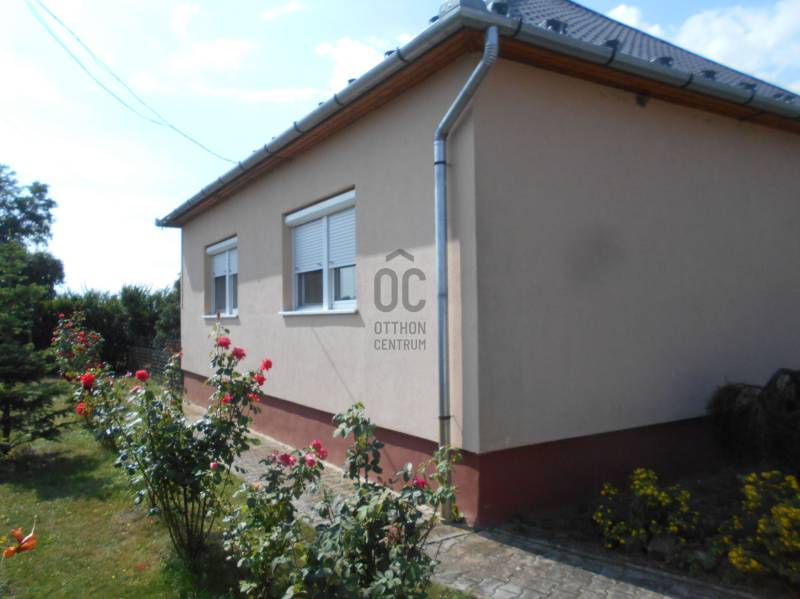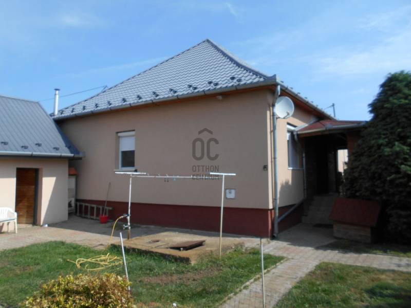 Megvételre kínálok Dögében, központhoz közeli csendes mellékutcában, egy 1980 -ban szilikátból épült, cserepes lemezzel fedett, szép állapotú családi házat 1145 nm -es, 65 x 11 méteres utcafronttal rendelkező saroktelken. A kívül hőszigetelt ingatlan belső elrendezése átgondolt, a két különnyíló szobáját és a tágas nappalit keményfa parkettával, a külön wc-t fürdőszobát járólappal, a konyha-étkezőt és a közlekedőt laminált padlóval burkolták. A külső nyílászárókat már hőszigetelt műanyagra cserélték, az ablakokat redőnnyel szerelték fel. A melegről központi fűtés gondoskodik, ami gáz és vegyes tüzelésű kazánnal is üzemel, de található az épületben egy hűtő-fűtő klíma is. Az udvaron fúrt kút és egy külön épületrész található, a kazánokkal, vizesblokkal (wc, illetve tusoló) valamint nyári konyha és műhely, továbbá egy különálló garázs is. A telek méretéből adódóan kettéosztható, a végébe egy második garázst építettek külön bejárati kapuval. A vételár tartalmazza a bútorzat egy részét is. Döge eladó családi ház