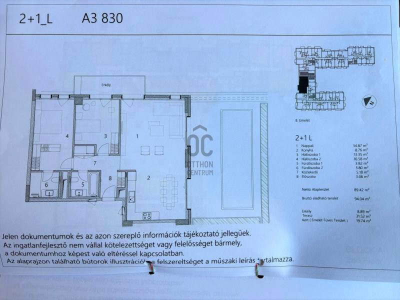 Eladó egy gyönyörű panorámás tetőteraszos és tetőkertes lakás a 9. kerület legmodernebb lakóparkjában!A CITY PEARL lakópark első ütemében átadott (2025. januárban) társasház 8. emeletén található VÁROSI PANORÁMÁS nagy teraszos, teraszkertes, erkélyes lakás.Lépjen be a főváros egyik legkülönlegesebb új építésű projektjébe, ahol a múlt öröksége és a modern életstílus tökéletes harmóniában találkozik!Ez a 89 m²-es Penthouse jellegű, természetes fényben úszó lakás, a hozzá tartozó 30 nm -es tetőterasszal és tetőkerttel valamint a 9 m²-es erkéllyel ideális választás saját otthonnak vagy értékálló befektetésnek, olyan vevők számára akik a városi panorámát keresik, illetve a prémium minőséget!A lakás már költözhető!ADOTTSÁGOK:- amerikai konyhás nappali (25 m2)- 2 dv hálószoba- 2 db fürdőszoba + WC- erkély- 30 nm Tetőterasz tetőkerttel mely ideális a barátokkal való grill partykhoz is.A lakás 8. emeleten található, ablakai és az erkélyei városi panorámával rendelkeznek utcai nézetűek. Délnyugati fekésévének köszönhetően a lakás nagyon világos.Fűtése távfűtés, hőszívattyűs fűtés rásegítésével. A lakáshoz egyedi mérők tartoznak mind a fűtés, áram és melegvíz fogyasztás nyomonkövetéséhez.A CITY PEARL lakóparkot jellemzi az átgondolt, magas minőségű kivitelezés!MŰSZAKI LEÍRÁSJelen lakásunk IX. ker. Soroksári út – Vágóhíd út – Vaskapu utca – Máriássy utca általhatárolt telekingatlanon található. Az épület egy kétszintes mélygarázsból és a földszinten felül/ kívül 12 emeletből áll. A parkolóka Vágóhíd utcai bejárat felől, egy védett, magántulajdonban levő területről közelíthetők meg. Azépületen kívüli közterületek burkolattal / kövezéssel csatlakoznak az épülethez. Az épületegység részét képezi egy belső kert szép parkosítással. A lakásokhoz vezető bejáratok aVágóhíd és a Vaskapu utcában helyezkednek el. Van egy gyalogos bejárat a Vágóhíd utcábantalálható Arkádon keresztül is, amely lehetővé teszi az embereknek, hogy elérjék a zöldterületet és a telek központjában található Piazzát.FŰTÉSI RENDSZERAz épület számára távhő renszer biztosítja a fűtést és melegvízet,egyedi mérőkkel.A hőfogyasztás mérése a kiépített elektromechanikus vagy ultrahangos áramlásmérőkkel(kaloriméterek) történik, amit a lakásokon belül a fő hőforrást a radiátorok és fürdőszobaitörülköző szárító radiátor biztosítják.LÉGKONDICIONÁLÁSNem lesznek közösségi területeken szabadtéri légkondicionáló egységek, minden apartman aszabadtéri egységeket a saját erkélyére helyezi. Az apartmanban 2 beltéri egység és 1szabadtéri egység lesz előkészítve a nappali és a fő hálószoba számára.Digitális kaputelefon rendszer:• Minden lakásban színes képernyőjű digitális kaputelefon kerül beszerelésre. A rendszersegítségével nyitható az épület bejárati ajtaja, továbbá lehetőséget biztosít arra, hogy alakásban és az ajtónál álló személy beszéljen egymással.• A csengő panelje az épületek bejárata közelében lesz. Ennek a panelnek a segítségével híváskezdeményezhető az épület bejáratánál. Ezen kívül a lakástulajdonosok az épület bejáratiajtaját egy jelszóval tudják kinyitni, így kulcs használata nélkül tudnak az épületbe bejutni.Hálószobák:Padlóburkolat: Jó minőségű laminált padló lesz telepítve egy vékony szigetelőréteggel ellátott esztrich rétegen.Falburkolat: A falak gipsz anyagú vakolatot, glettelést és vízbázisú festéstkapnak.Szegély: A padlóburkolathoz igazodó szegélyek kerülnek alkalmazásra.Mennyezeti burkolat: A mennyezet gipsz anyagú glettelést és vízbázisú festést kapNappali:Padlóburkolat: Jó minőségű laminált padló lesz telepítve egy vékony szigetelőréteggel ellátott esztrichen.Falburkolat: A falak gipsz anyagú vakolatot, glettelést és vízbázisú festéstkapnak.Szegély: A padlóburkolathoz igazodó szegély kerülnek alkalmazásra.Mennyezeti burkolat: A mennyezet gipsz anyagú glettelést és vízbázisú festést kapBIZTONSÁG:A bejárati ajtók több ponton záródó típusúak és a MABISZ (Magyar Biztosítók Szövetsége)előírásainak megfelelnek. A garázsajtó alumínium és fém-szerkezetű és távirányítássalműködik. Az épületen kívül és a közös helyiségekben a biztonsági szobával összekötött CCTVfelügyeleti rendszer lesz telepítve.PARKOLÁS• A parkolóhelyek külön vásárolhatók A parkolóhelyek méretei változóak, a következő listaszerint• Nagy parkolóhely: (2.5m vagy szélesebb) x (5.0 -5.5 m)
